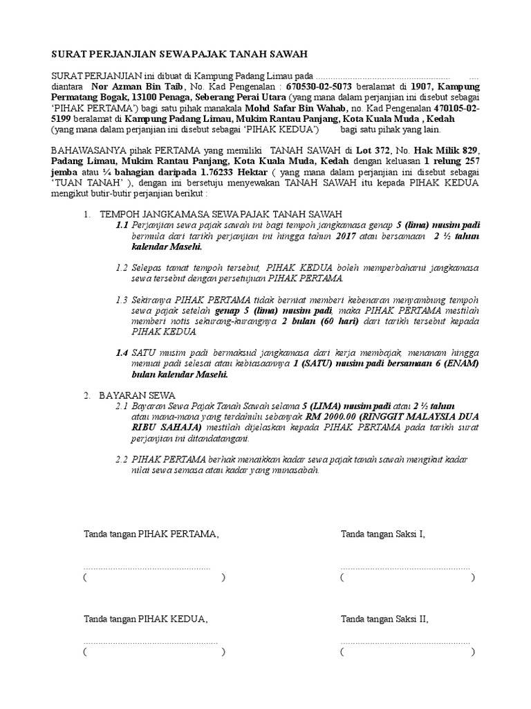 Surat Perjanjian adalah surat yang digunakan untuk mengatur tentang hak dan kewajibah antara dua orangpihak yang melakukan sebuah kesepakatan atas sebuah perkara dan bersifat mengikat. 38 Tahun Pekerjaan. Bersetuju dan berjanji untuk membenarkan PENYEWA TANAH menggunakan tanah seperti tersebut di atas untuk apa-apa tujuan pertanian berdasarkan syarat-syarat yang dinyatakan dibawah selama 2 tahun bermula daripada 2009 sehingga 2011.